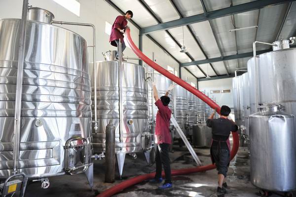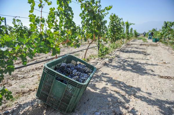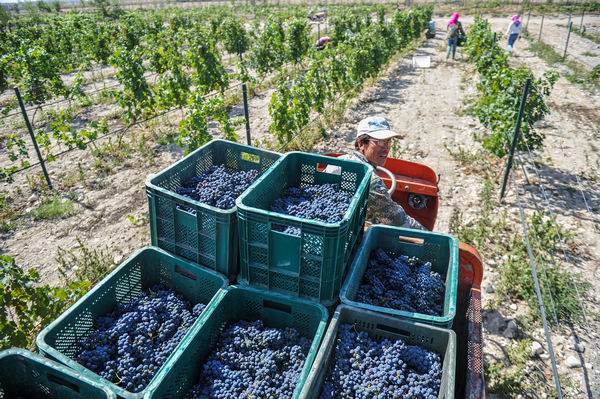 在寧夏銀川銀色高地酒莊的葡萄園,工人正在將收獲的赤霞珠葡萄運往釀酒車間。園里人工和機械化并用,對葡萄園的規劃和管理也有一定的標準。