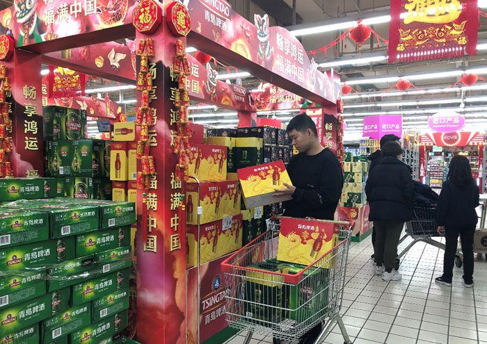 “青島啤酒作為知名的酒水品牌,像經典1903、純生、奧古特、鴻運當頭等基本上都不需要多做介紹,顧客就非常熟悉了。尤其春節期間,鴻運當頭、奧古特等中高端產品格外受青睞,有些顧客來到以后,提起來就往購物車里放”,商超工作人員高先生介紹。