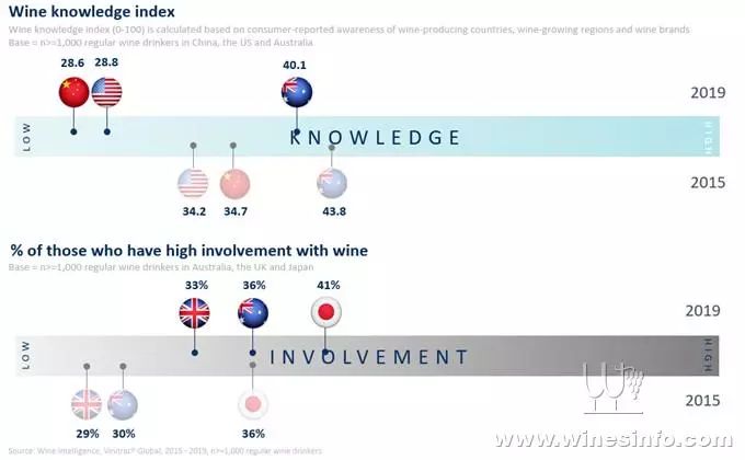 在主要市場中,澳大利亞和日本的葡萄酒市場在過去五年中增長最快。在日本,高參與度的葡萄酒消費(fèi)者的比例已經(jīng)從2015年的36%上升到2019年的41%,而澳大利亞高參與度的葡萄酒消費(fèi)者比例從30%上升到36%。