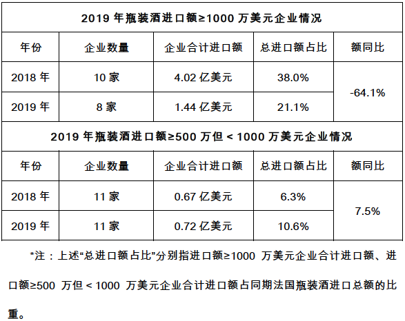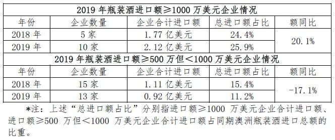進(jìn)口法國瓶裝酒頭部企業(yè)(指進(jìn)口額≥500萬美元以上的企業(yè))近兩年數(shù)量維持在20家上下,但其2019年進(jìn)口總額,尤其是≥1000萬美元企業(yè)的進(jìn)口總額,絕對值減少近2.6億美元,出現(xiàn)腰斬式銳減(同比-64.1%)。與之形成對比的是,同期同等量級(jí)的澳洲酒進(jìn)口商數(shù)量增加并超過法國,且進(jìn)口總額亦實(shí)現(xiàn)超車。