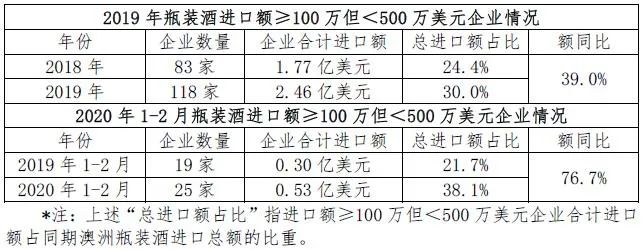 在2019年進(jìn)口葡萄酒市場大盤下行情況下,腰部企業(yè)(指進(jìn)口額≥100萬但<500萬美元的企業(yè))數(shù)量和合計(jì)進(jìn)口額均較快增長。尤其是今年1-2月受到疫情不利影響下,腰部企業(yè)進(jìn)口總額增幅近8成,使得其市場份額占比高于去年同期超16個(gè)百分點(diǎn)。