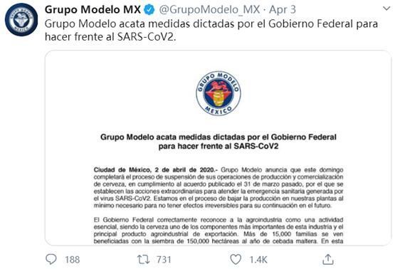 莫德洛集團(tuán)在推特上發(fā)表的一份聲明中表示,由于墨西哥政府已經(jīng)關(guān)閉了非必要的商業(yè)活動(dòng),所以該公司正在停止其啤酒生產(chǎn)和銷(xiāo)售。