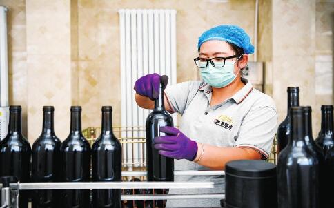 近年來,寧夏大力推進葡萄酒產業(yè)發(fā)展,走出了一條葡萄酒產業(yè)與文化旅游產業(yè)融合發(fā)展之路。截至2019年底,寧夏葡萄種植面積達到57萬畝,現(xiàn)有酒莊211家,產業(yè)綜合產值達260億元。圖為寧夏志輝源石酒莊工作人員在葡萄酒生產線上忙碌。