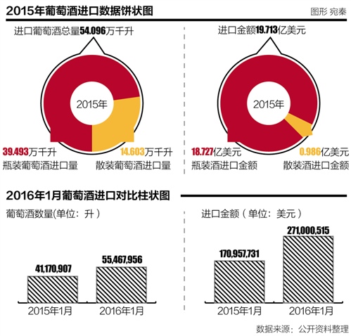 中國食品土畜進出口商會引用海關(guān)數(shù)據(jù)顯示,去年包括葡萄汽酒、瓶裝酒和散裝酒,我國進口葡萄酒5.5億升,同比增長45%;進口額達到破紀錄的20.4億美元,同比增長34%。而在2013年和2014年,葡萄酒的進口額同比均為負增長。
